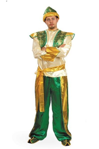 В комплект карнавального костюма султана входят тюрбан, пояс, тапочки, шаравары и рубаха с жилетом.