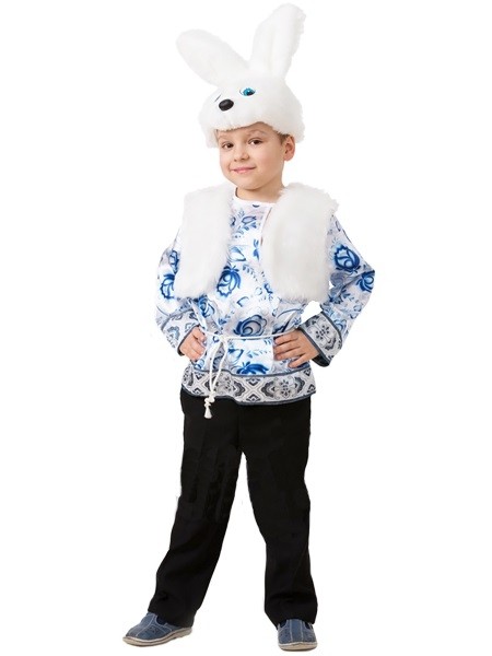 Детский костюм зайчика подойдет для новогодних детских утренников и подобных мероприятий. В комплект входит атласная рубашка белого цвета с голубым узором в стиле гжель. К рубашке прилагается меховой жилет без застежки, а также шапочка-маска с ушками в виде мордочки зайчика.