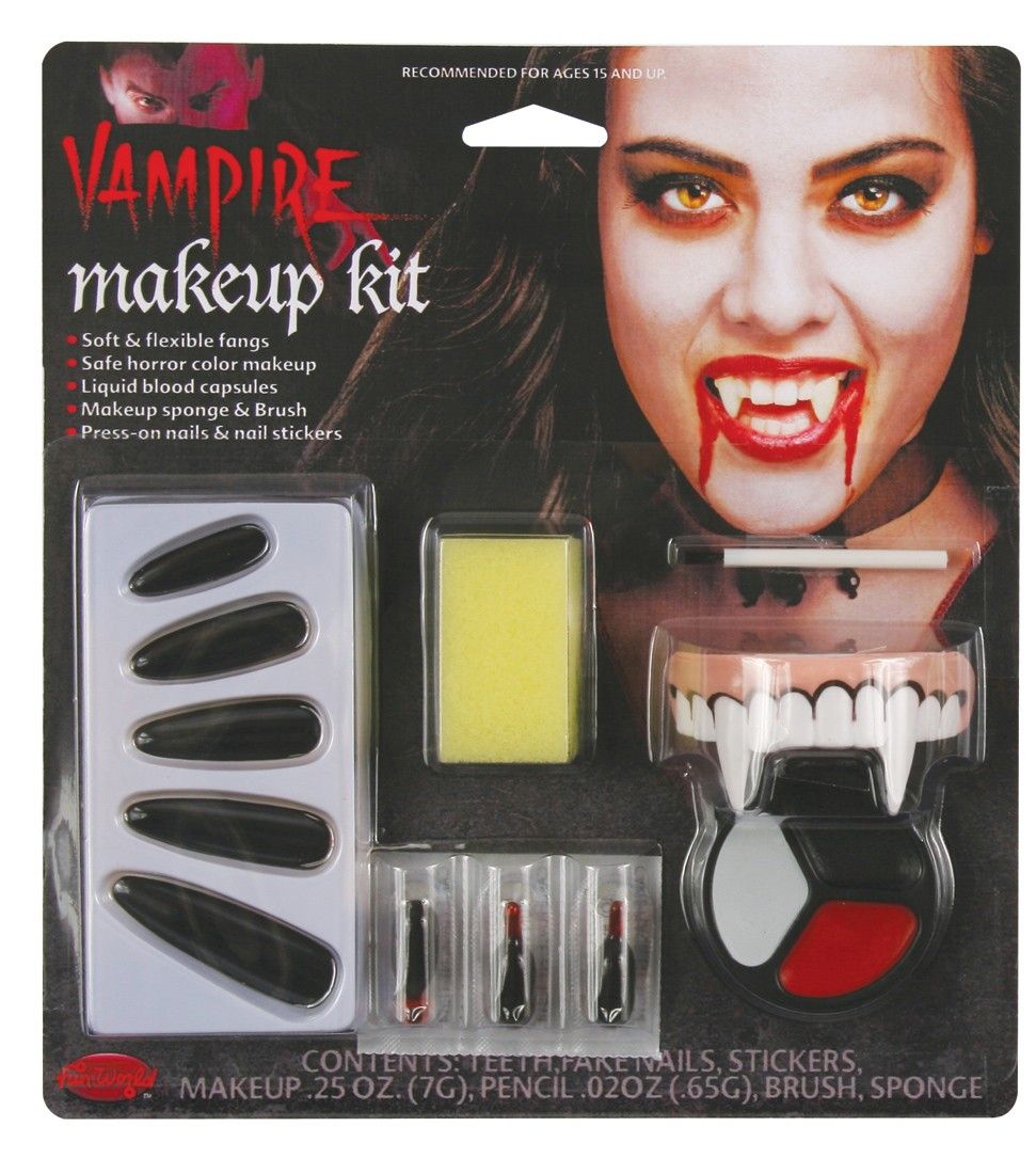 Набор для грима Вампирша включает в себя лоток с косметикой трех цветов: черный, белый и красный, вставную челюсть с клыками белого цвета, три капсулы с кровью, накладные черные ногти, характерные для вампирш, кисточку и губку для легкого нанесения грима.