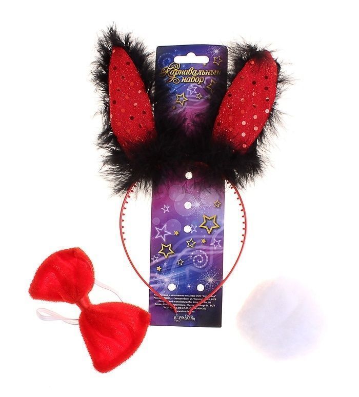 Набор зайчика состоит из ободка с красными ушками, которые декорированы пайетками и черным пухом, красного банта и белого хвостика. Комплект можно надеть на маскарадную вечернику или использовать для ролевых игр.