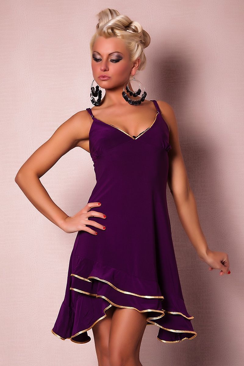 Фиолетовое платье с золотой отделкой - это свободное платье на тонких бретельках. Подол платья неровный и асимметричный с несколькими слоями, по краям каждого слоя имеется золотая отделка. На спине переплетаются две тонкие лямочки, создавая некий узор.