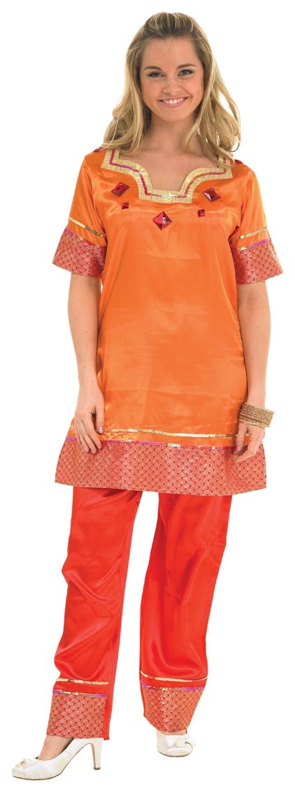 Очень приятный на вид костюм пестрого оранжевого цвета подойдет для любителей безметежного индийского солнца. В костюм индийской леди входят: туника и штаны.Рекомендации по уходу: Только чистка по месту загрязнения.