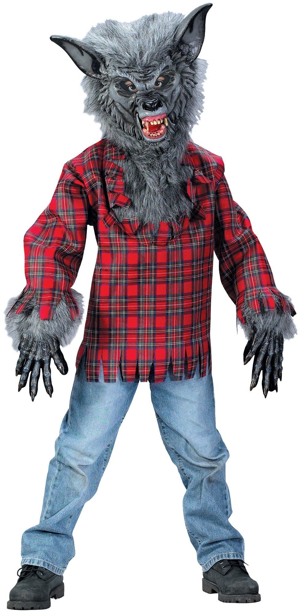 Детский костюм оборотня серый включает в себя серую маска оборотня, морда и уши которого выполнены из латексного материала, вся остальная часть покрыта мягким пушистым материалом. Также в комплект входят соответсвующие серые перчатки и красная рваная рубашка в клетку.