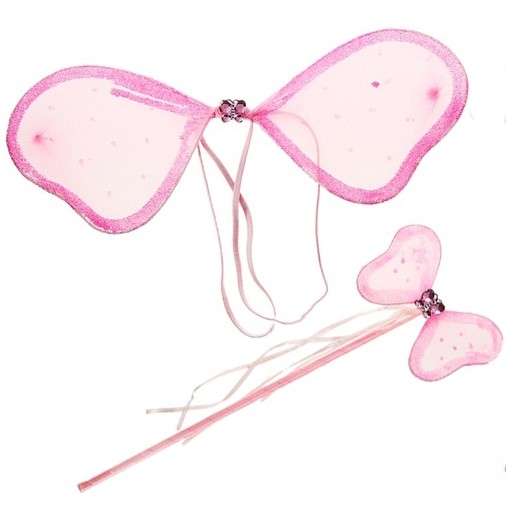 Розовый набор феи состоит из легких крылышек и волшебной палочки, украшенных ленточками и камнями в виде бабочек. Прекрасно дополнит костюмы фей и бабочек.