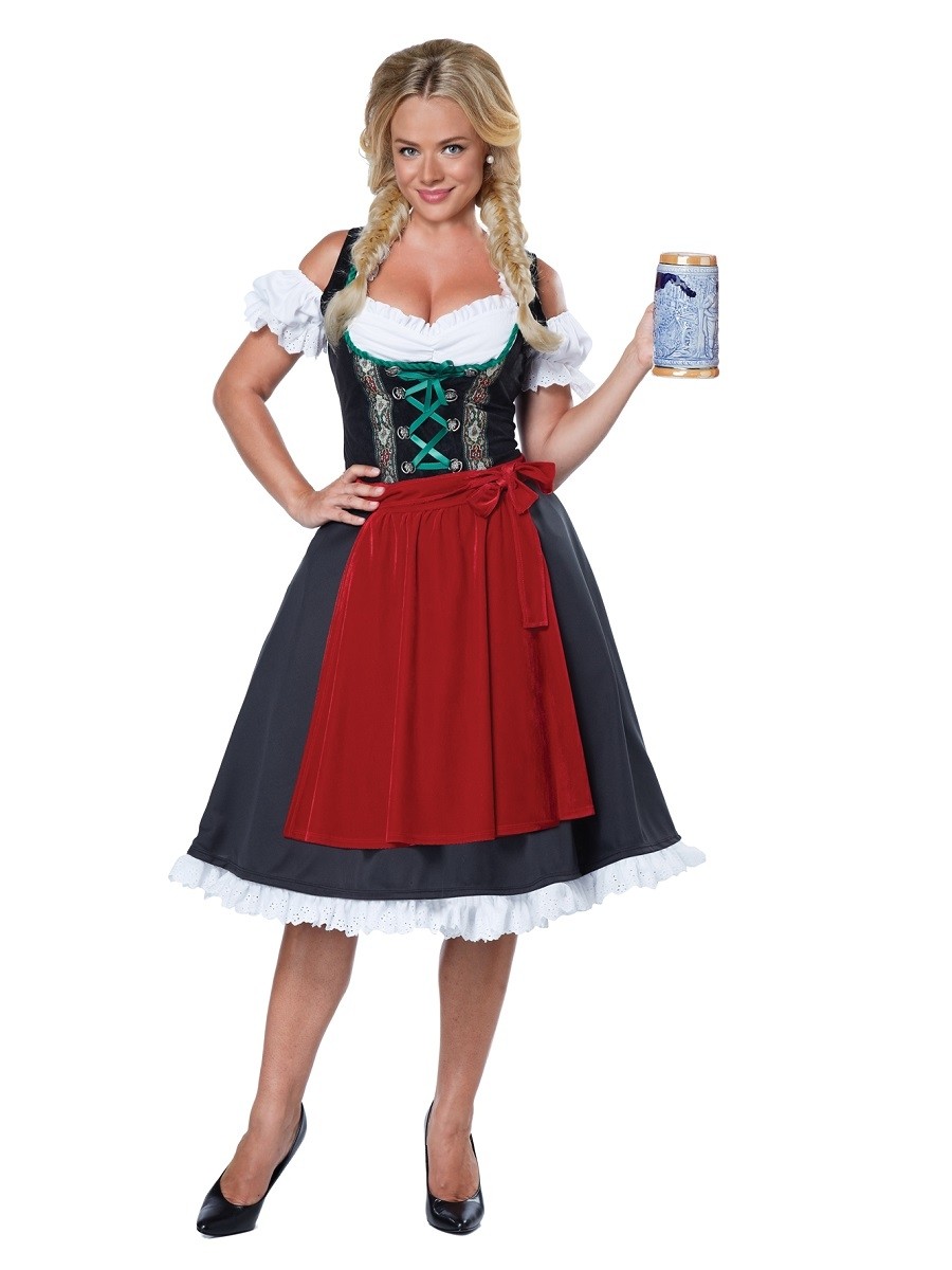 Костюм официантки Октоберфест представляет собой великолепное платье средней длины с имитацией корсета с зеленой шнуровкой и красный фартук. Также в комплекте пышный подъюбник.