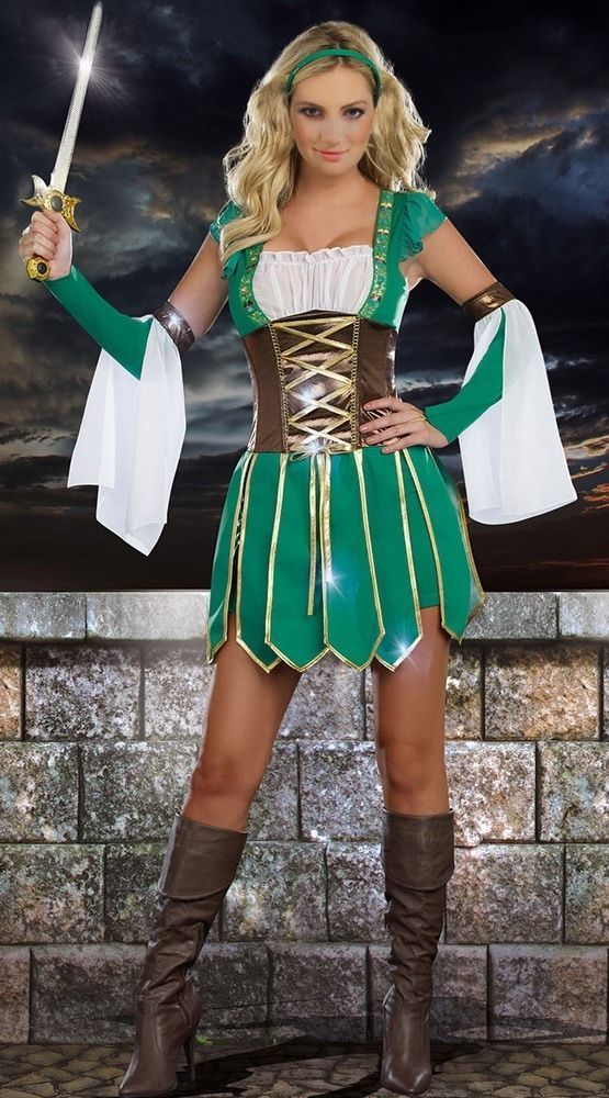 Костюм Воина эльфов женский включает в себя бело-зеленое платье с коричневым корсетом и золотистой шнуровкой. Также в комплект входит зеленая юбка с золотой окантовкой, головной убор и нарукавники, выполненные в бело-зеленом цвете.