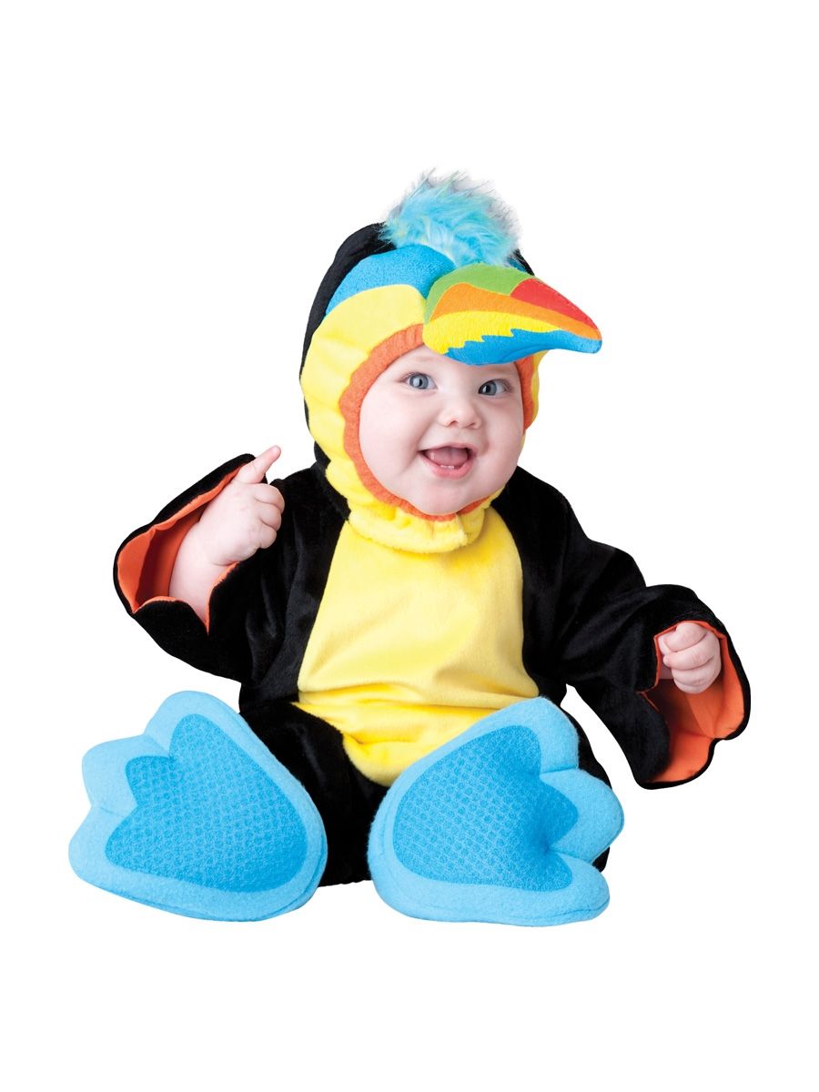 Если вы любите оригинальные костюмы, то костюм птицы тукан специально для вас. Будьте уверены, что в таком наряде вы не встретите больше ни одного малыша. Черный комбинезон с яркой желтой грудкой имеет снизу специальные кнопочки для быстрой смены подгузника. Головной убор с ярким желты клювом привлекает внимание и останавливает взгляд. В комплекте также идут мягкие тапочки с антискользящей подошвой. Костюм птицы тукан подойдет для празднования Дня рождения, утренника или фотосессии.