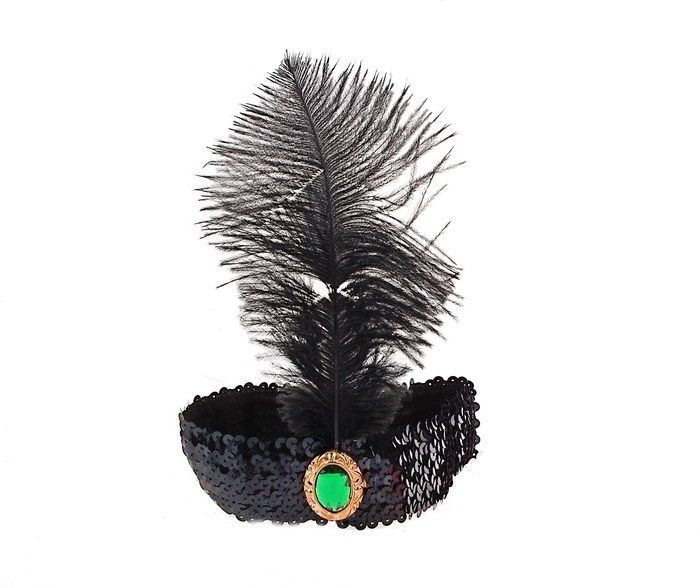 Черная повязка на голову с длинным пером и расшитая пайетками. Повязка станет отличным дополнением к восточным костюмам.