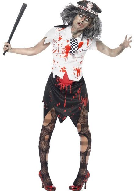 Костюм зомби полицейской включает в себя юбку, рубашку с галстуком и фуражку. Подобрав к костюму грим, парик и другие аксессуары, вы сможете дополнить свой образ. Костюм подойдёт для Хэллоуина, Пятницы 13, тематических праздников и вечеринок.