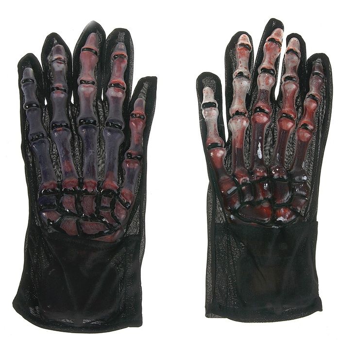 Перчатки Скелетные руки с кровью - это тонкие черные перчатки с накладными пластиковыми костями рук скелета. Кисти выполнены из прозрачного пластика и наполнены искусственной кровью.
