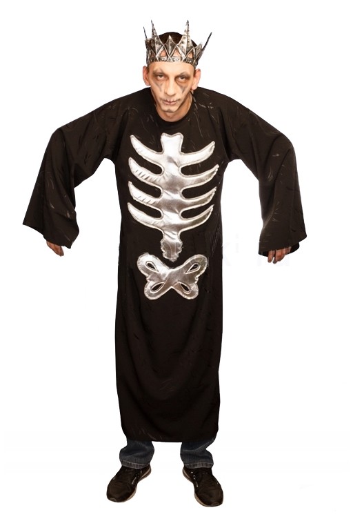 Костюм Кащея Бессмертного для взрослых отлично подойдет для постановки спектакля и подобных мероприятий. В комплект входит длинный черный плащ, дополненный серебряной вставкой в виде костей скелета. Также образ дополняет корона серебряного оттенка.