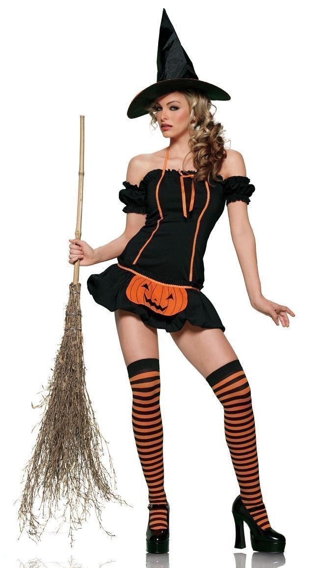 Костюм красотки ведьмы с аппликацией в виде хэллоуинской тыквы. В комплекте платье, шляпа. Дополните к образу чулки, туфли и метелку.