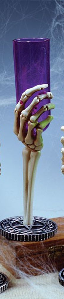 Фиолетовый бокал Рука скелета прекрасно подойдет для Хэллоуина и подобных праздников. Ножка бокала представляет собой руку скелета, которая установлена на круглой подставке с пентаграммой. Рука держит питьевую часть бокала, которая сделана из фиолетового стекла.
