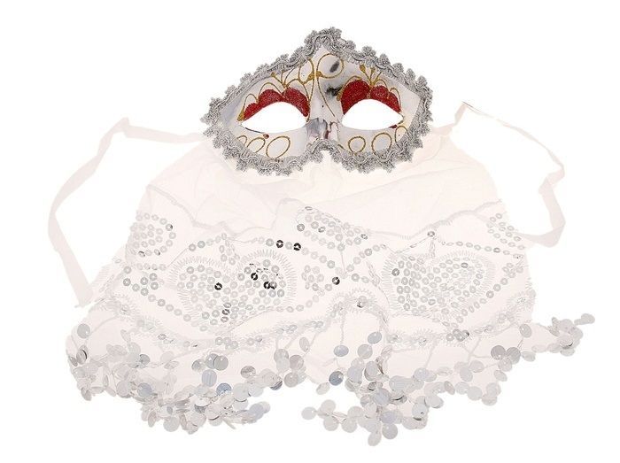 Серебристая маска с вуалью, расшитая пайетками, для дополнения маскарадных костюмов в восточном стиле или в качестве самостоятельного аксессуара для маскарадной вечеринки. Размер маски 18х34.