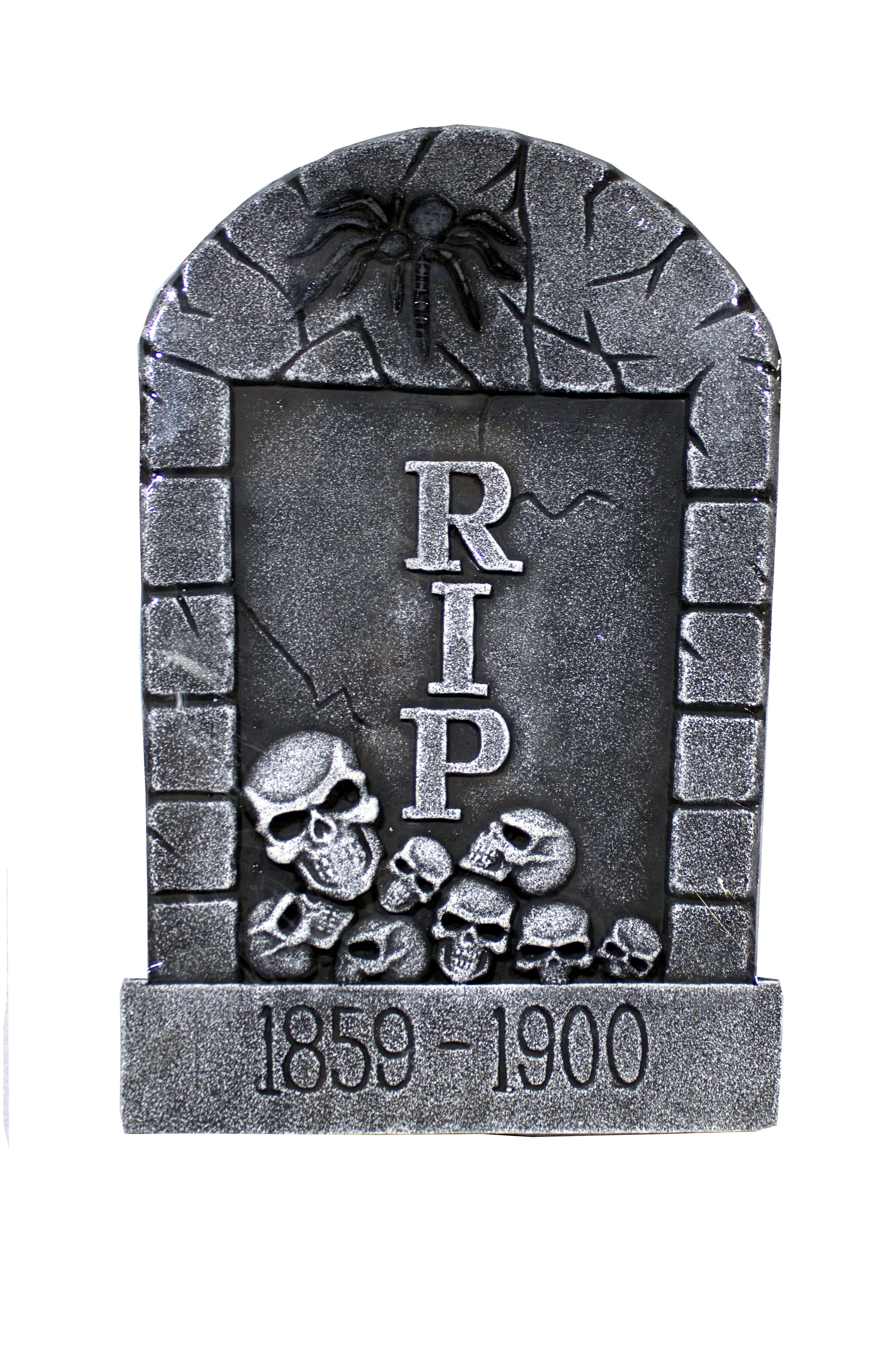 Надгробие с черным паучком выполнено в виде надгробной тяжелой плиты из пенопласта, покрытого серой краской. Его дополняет черный блестящий паук, черепа и надпись RIP.