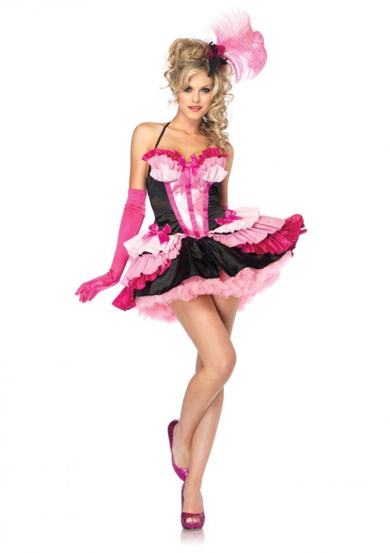 Костюм яркой фламинго включает в себя яркое пышное платье, выполненное в розово-черном цвете и украшенное рюшами, к платью прилагается бантик, который крепится сзади на юбке, а также головной убор с розовым большим пером и клювом.