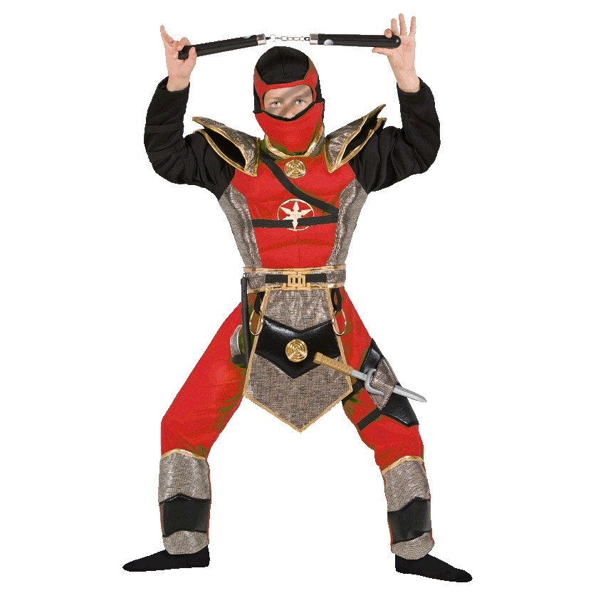 Костюм Ниндзя красного цвета - яркий костюм который включает в себя красно-черный комбинезон с золотистой отделкой. Комбинезон с набивными мышцами. Также его дополняет золотистый пояс с эмблемой и завершает образ шапочка-маска с прорезью для глаз.