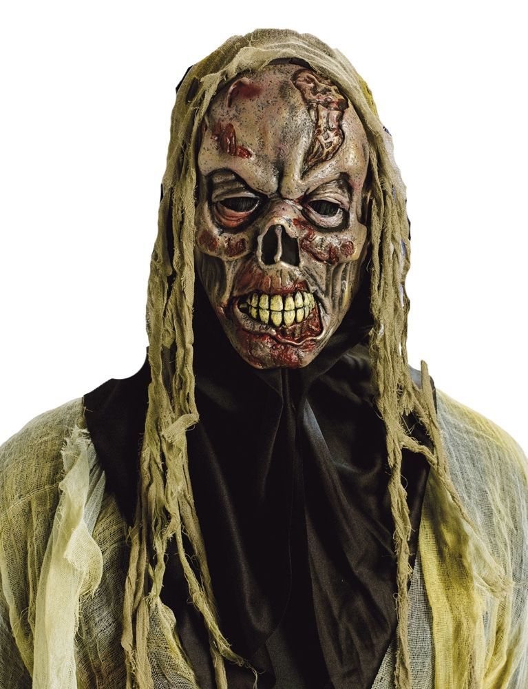 Маска Зомби-Черепа на Хэллоуин - злой взгляд, кривой рот с пожелтевшими зубами, рваные раны и марлевая накидка на голове. Такая маска идеально подходит для Хэллоуина и подобным жутким праздникам.