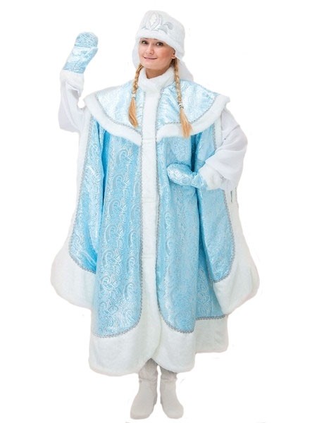 Костюм боярыни-Снегурочки выполнен в светло-голубом цвете из парчи. В комплект входит длинная свободная шуба с серебряными узорами. Шуба с длинными рукавами и высоким воротником с меховой отделкой. Также в комплект входит белая меховая шапочка и голубые варежки с серебряными узорами.