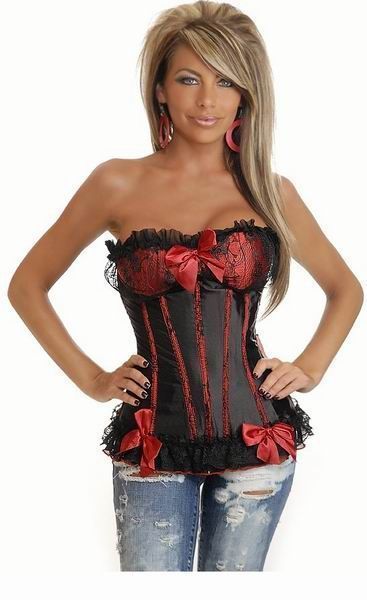Корсет - вулканический бурлеск с мягкими чашечками, декорированный красными бантами, без бретелек, на молнии сзади и застежками сбоку.