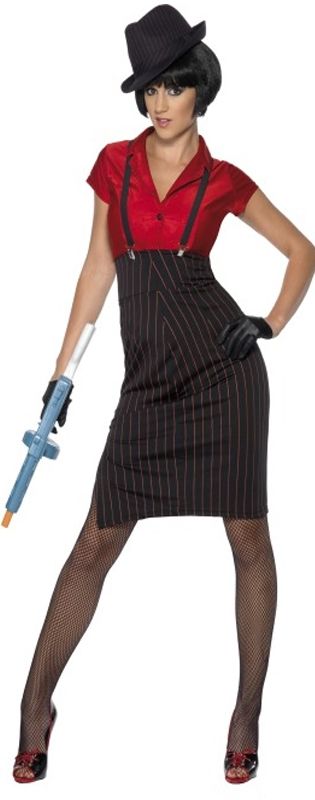 Костюм беспощадной гангстерши включает в себя яркую красную рубашку, юбку в полоску, подтяжки и перчатки. Шляпа и оружие в комплект не входят, но вы можете приобрести дополнительно различные аксессуары к костюму у нас на сайте.