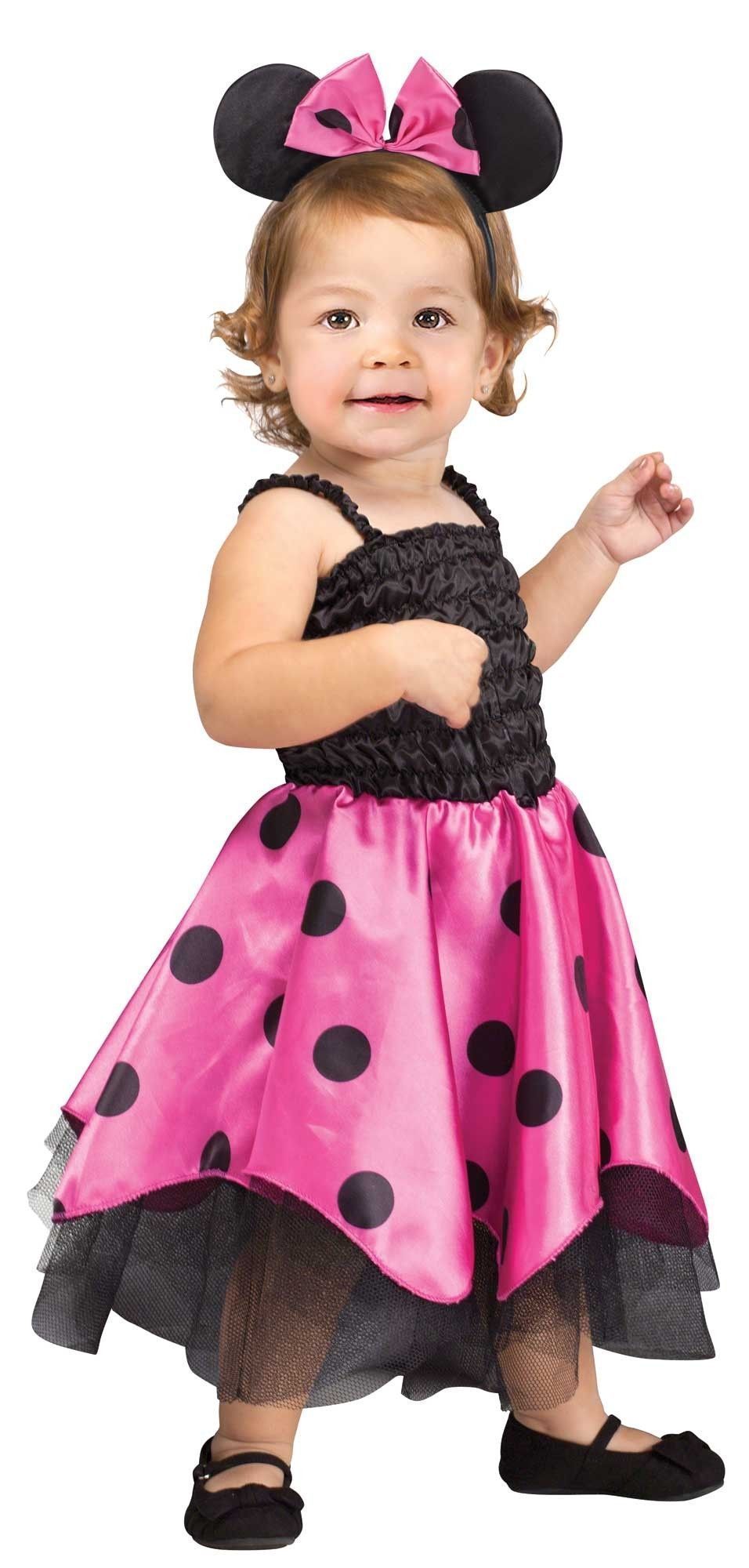 Детский костюм Мышонка включает в себя платье с черным гофрированным верхом и пышной розовой юбочкой в черный горох. Подол платья выполнен из черного сетчатого материала. К платью прилагаются ушки на ободке с розовым бантиком.