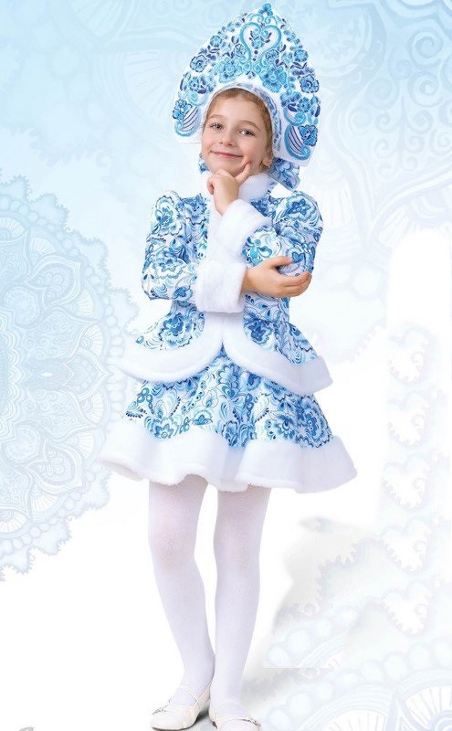 Детский костюм Снегурочки Гжель включает в себя голубую узорчатую курточку с белой меховой отделкой, пышную юбочку с узором в стиле Гжель и меховым подолом, а также узорчатый фигурный кокошник.