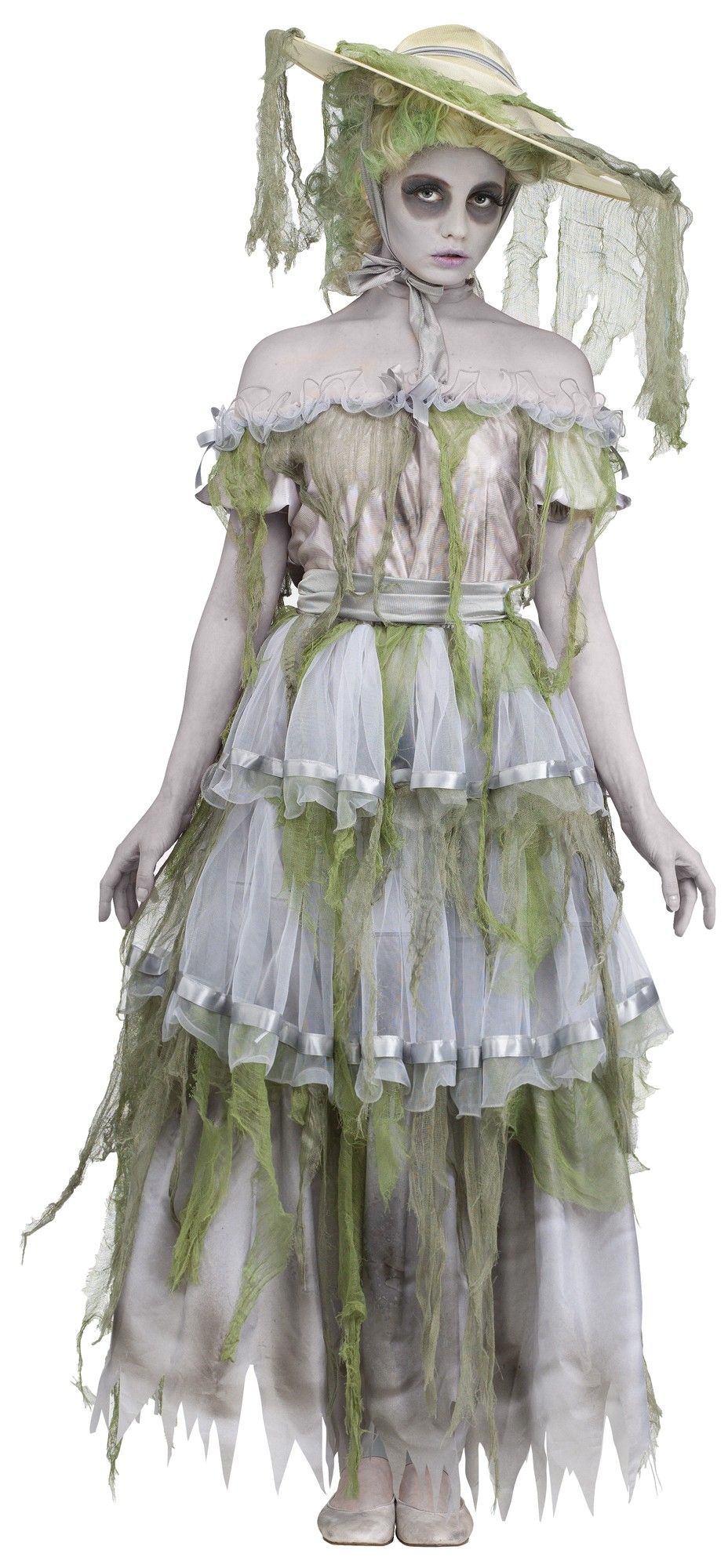Костюм Зомби Южной красавицы - прекрасный выбор для вечеринки в честь Хэллоуина. Костюм включает в себя длинное кружевное платье с атласным поясом. Платье выполнено в серо-зеленых цветах. Также в комплект входит соответствующая шляпа на завязочках.