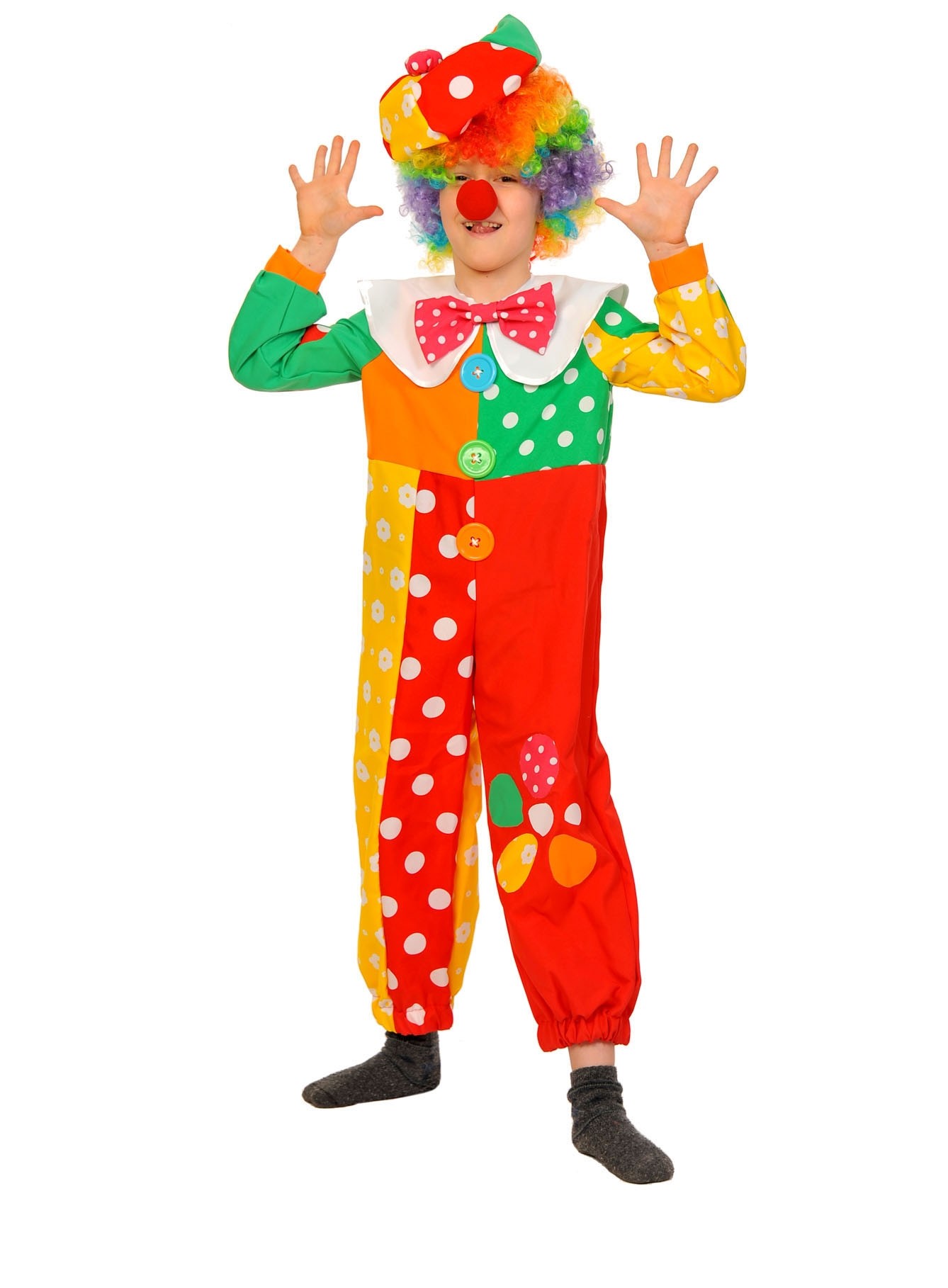 Детский костюм Клоуна Фили включает в себя яркий разноцветный комбинезон, украшенный белым воротничком с красным галстуком-бабочкой. Также комплект дополняет яркая разноцветная кепка, разноцветные кудрявые пряди волос и красный нос.