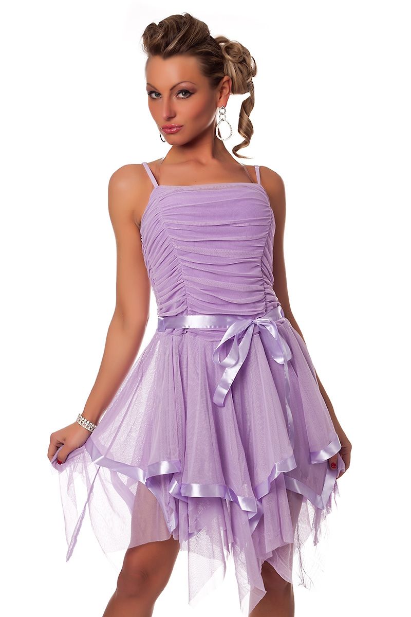 Сиреневое легкое платье прекрасно подойдет для новогодних празднований и клубных вечеринок. Платье на тонких бретельках, многослойная юбка с неровным подолом с асимметричными краями, по одному из слоев протягивается нежная атласная ленточка. Верхняя часть украшена аккуратными сборочками, по поясу проходит атласная ленточка с бантиком.