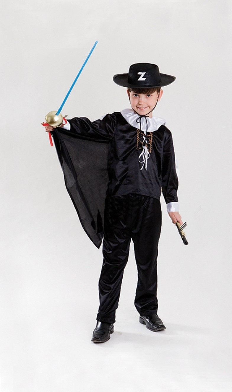 Костюм отважного Зорро для детей выполнен из бархатного черного материала и включает в себя черную рубашку с белым воротником и пришитым плащом, черные бархатные брюки и черную шляпу с белой буквой Z, которая является символом Зорро.