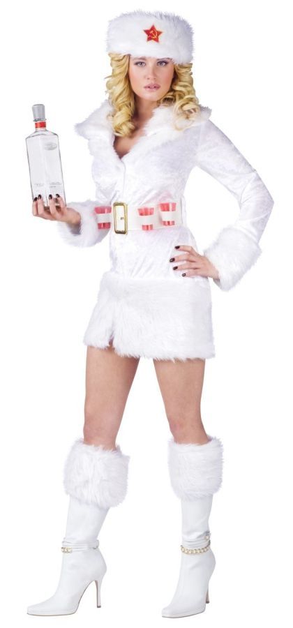Оригинальный костюм русской водки - это белое платье-пальто с меховой отделкой, накладками на обувь, шапкой и поясом с рюмками. В таком костюме можно встречать гостей, особенно тех, кто опоздал и наливать штрафную чарку. Великолепный костюм для празднования юбилеев в загородном доме холодной зимой. Бутылка в комплект не входит.