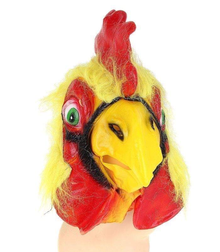 Маска петуха желтого цвета с красным гребешком. Маска сделана из латекса и имеет размер 35х40 см. Маска выглядит очень натурально и отлично подходит для театральных постановок и детских утренников.