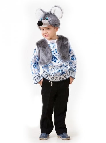 Детский костюм мышонка в стиле гжель отлично подойдет для утренников и спектаклей. В комплект входит бело-голубая рубашка с рисунком гжель, серая меховая жилетка и маска в виде мордочки мышонка.