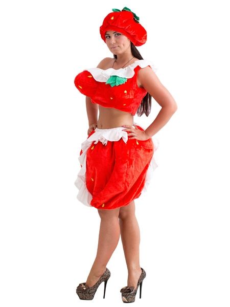 Красный костюм Клубнички выполнен из мехового материала. В комплекте костюма имеется красная юбка с белой отделкой, короткое бюстье, а также красная шапочка с зеленым хвостиком.