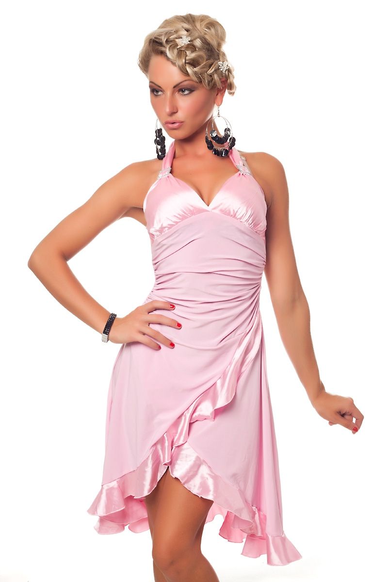 Светло-розовое латино платье - это очень нежное и легкое платье. Одна бретелька через шею выполнена из атласного материала. Верхняя часть также выполнена из атласа. Передняя часть украшена небольшими складочками. Неровный подол имеет атласную блестящую отделку.