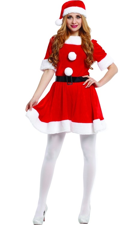 Костюм милой подружки Санты - очаровательный наряд для Новогодних праздников. Костюм выполнен в красно-белом цвете и включает в себя платье с помпонами, шапочку и черный пояс.