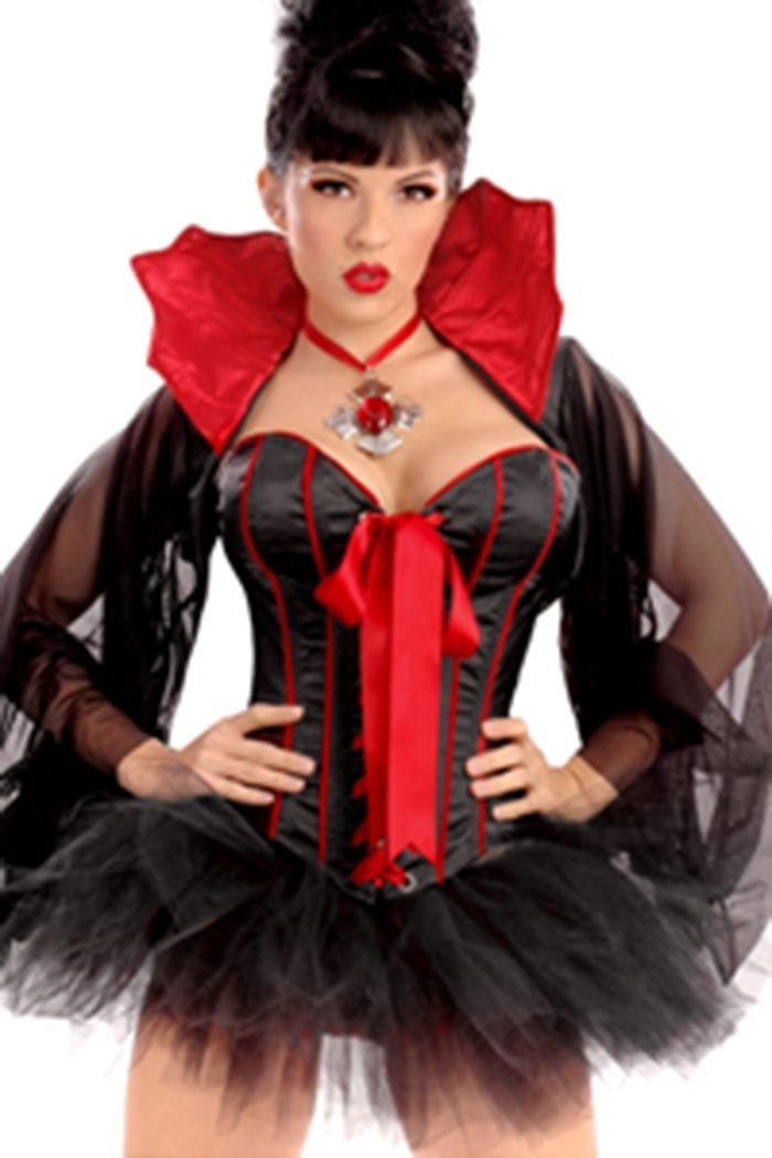 Корсетный костюм вампирши Deluxe включает в себя черный корсет с красной отделкой и красным атласным бантом спереди, черную юбочку туту, а также высокий воротник с легкими сетчатыми рукавами.