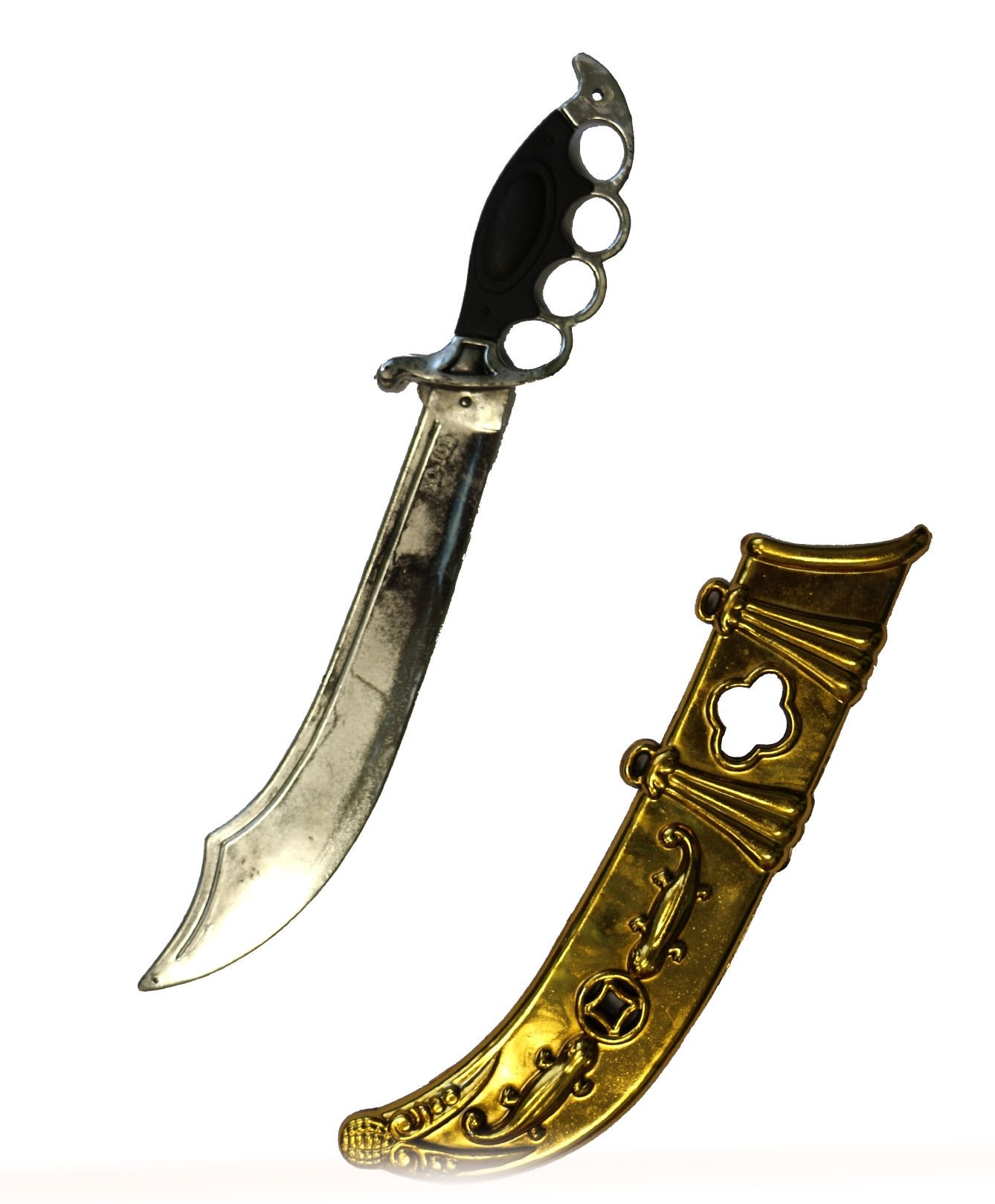 Сабля в ножнах - это отличное дополнение к пиратскому образу. Сабля и ножны выполнены из прочного пластикового материала. Рукоятка сабли в виде кастета, ножны золотистого цвета.