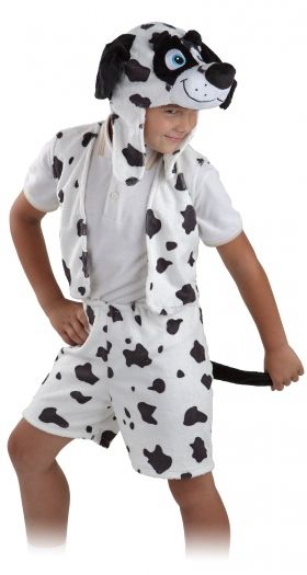 Карнавальный костюм Далматинца выполнен в белом цвете в черное пятнышко. В костюм входят короткие шортики с черным хвостиком, легкая жилетка, а также шапочка-маска с мордочкой милого далматинца, закрывающая ушки.