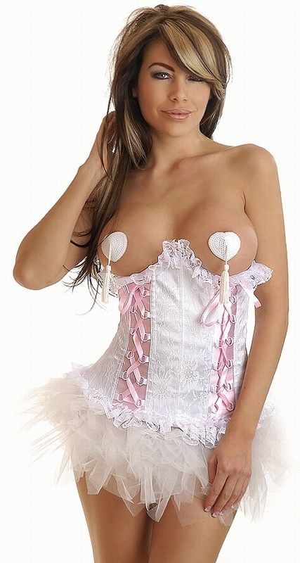 Корсет белый кружевной под грудь выполнен из ажурного белого материала. Спереди корсет украшен двумя светло-розовыми шнуровками. Верхняя часть корсета с рюшами. К корсету прилагаются соответствующие стринги и коротенькая белая юбочка. Наклейки на соски в виде сердец будут идеальным дополнением к этому комплекту.