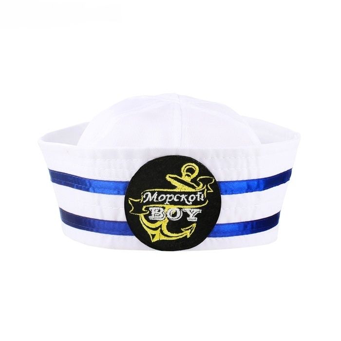 Белая шляпа юнга украшена двумя синими полосками. А также по-середине имеется черная эмблема с надписью "Морской boy".