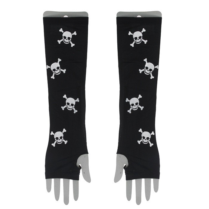 Перчатки с черепками без пальцев - длинные черные перчатки, украшенные белыми черепками с костями. Перчатки смогут дополнить готический костюм и подобные образы.