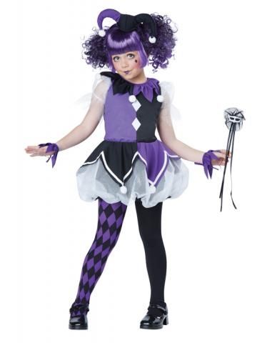 Детский костюм шута - это яркий костюм для девочек, который включает в себя платье, сочетающее в себе черный и фиолетовый цвета, рукава платья выполнены из белого сетчатого материала, как и юбка. В комплект также входит мини-шляпка с бубенчиками, воротник фиолетово-черного цвета, колготки с ромбами. Палочка с аппликацей и напульсники завершают образ.