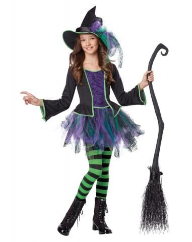Детский костюм Нарядной ведьмочки - яркий костюм, который идеально подойдет для Хэллоуина, Пятницы 13 и подобных праздников. В комплект костюма входит платье с пышной юбкой-пачкой, полосатые черно-зеленые колготки и конусная шляпка ведьмы, украшенная сетчатыми ленточками.