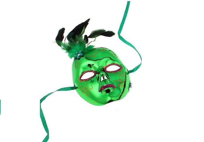 Маска в виде лица зеленого цвета, украшенная перьями и маленьким цветочком, настоящая находка для любителей карнавальных вечеринок. Маска полностью скроет лицо и вы сможете сохранить тайну своего присутствия на вечере. Маска сделана из пластика и имеет размер 4х16х35 см.