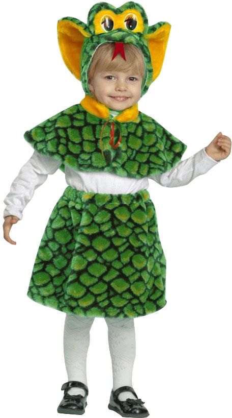 В комплектацию костюма зеленой змейки входит пелерина текстурированная рисунком в стиле "змеиная кожа". Материал костюма - искусственный мех. Так же в комплектацию входит юбка. Завершает образ костюма змеи оригинальный головной убор в форме змеиной головы.