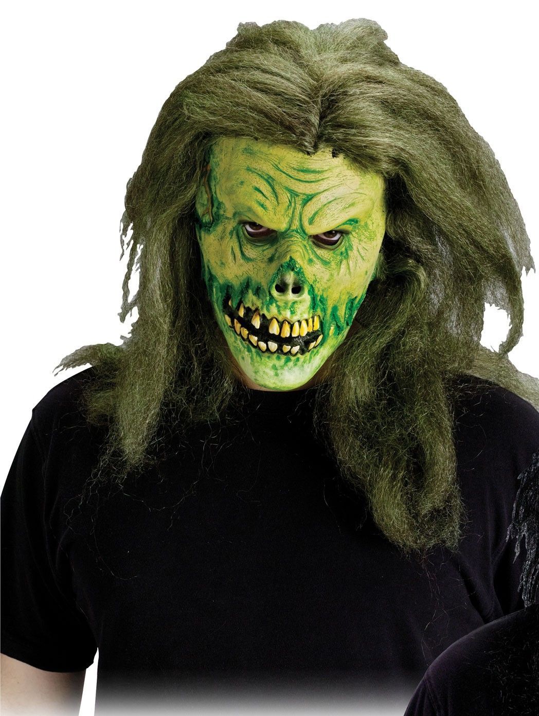 Зеленая маска зомби-скелета с волосами - это латексная маска-череп кислотно-зеленого цвета. У зомби кривые пожелтевшие зубы и множество глубоких морщин. В маске имеются небольшие прорези для глаз. Также к маске прикреплены волосы грязного болотного цвета.