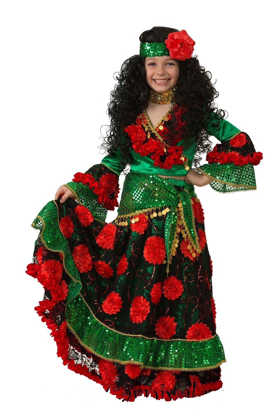 Детский зеленый костюм цыганки - яркий костюм, который включает в себя красно-зеленую блузку с запахом, которая украшена красными рюшами и золотистой тесьмой с монетками, длинную черную юбку, украшенную красными цветами. По подолу юбка украшена блестящими зелеными пайетками. К юбке прилагается блестящая зеленая косынка с золотистой тесьмой с монетками. Образ завершает черный парик кудрявых волос и головной убор, украшенный зелеными блестящими пайетками и красным цветком.