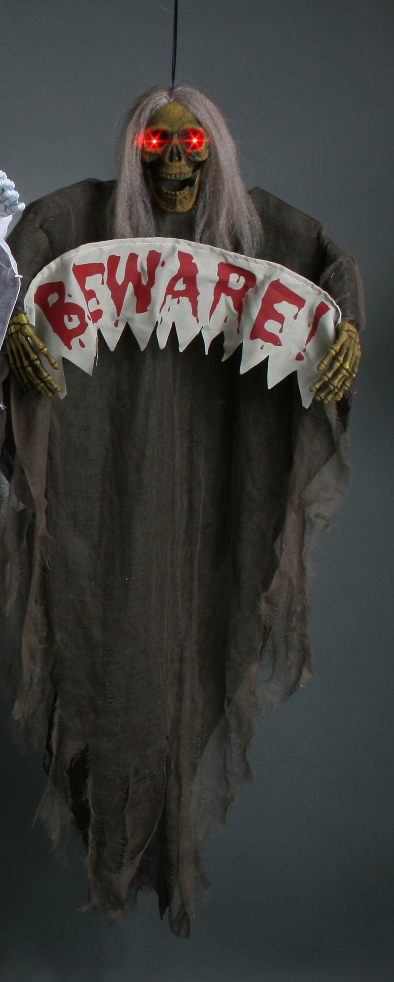 Подвесная Смерть Beware - это большая подвесная фигура, выполненная в серых тонах. У смерти красные светящиеся глаза, а с черепа свисают серые неухоженные волосы. Фигура одета в серый длинный плащ с рваными краями. Смерть держит растяжку с красной надписью Beware!.